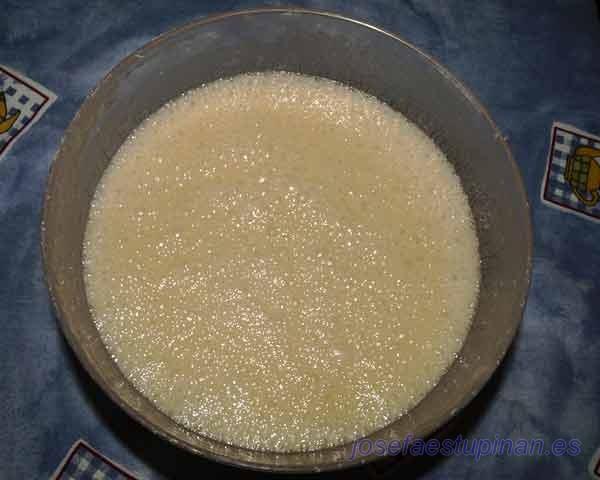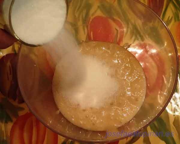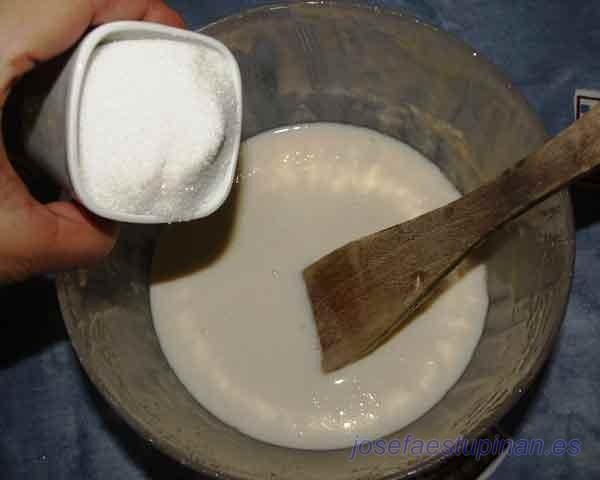 - Jueves: pasa la masa madre a un bol grande de cristal y añade un vaso de azúcar y otro de harina. No mezclar.