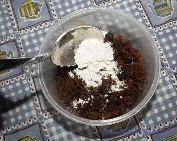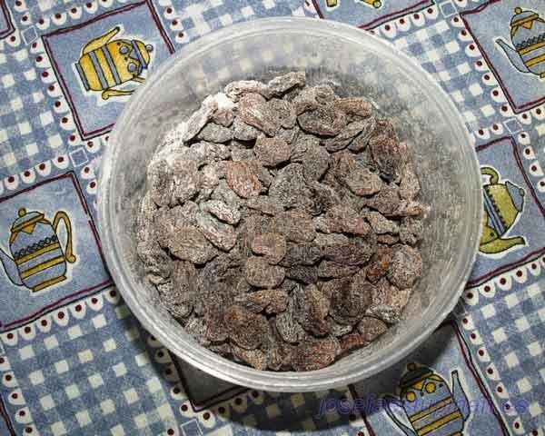 - Introduce las pasas y una cucharadita de harina en un recipiente con tapa, cierra el bote y agita.