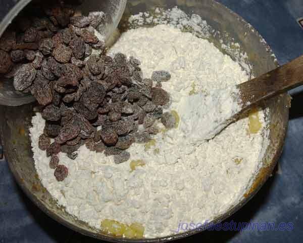 - Añade las pasas enharinadas y mezcla con la cuchara de madera.